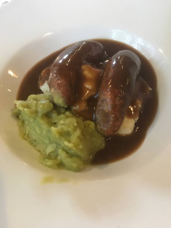 A very tasty bangers and mash at the Plough at Normanton on the Wolds the gravy made the meal , the texture of the mash and mushy peas was very smooth , and the sausage was very high quality meat full of flavour , I strongly recommend that you try this if you would like a traditional pub lunch